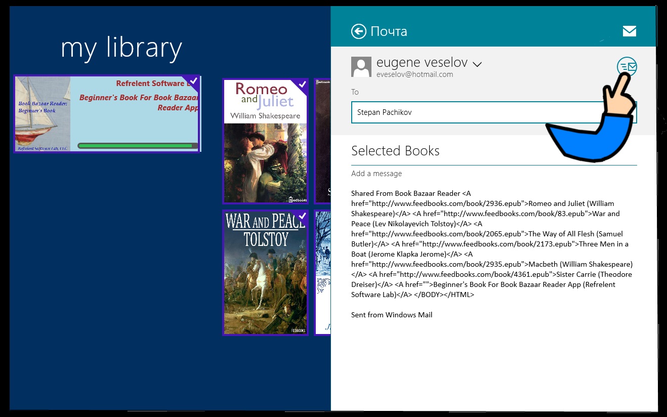 After the books are selected, you can call the system "Share" charm and choose an external app you want to use for sharing - typically it will be Mail.
